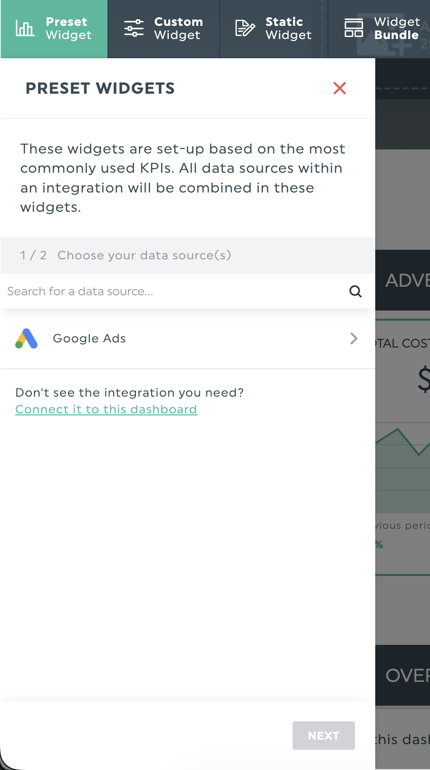 These widgets are automatically recommended based on your chosen report template and connected data sources. They pull relevant KPIs from each integrated platform. For example, linking Google Ads will populate your dashboard with that platform's key metrics, such as impressions, clicks, and conversion rates.