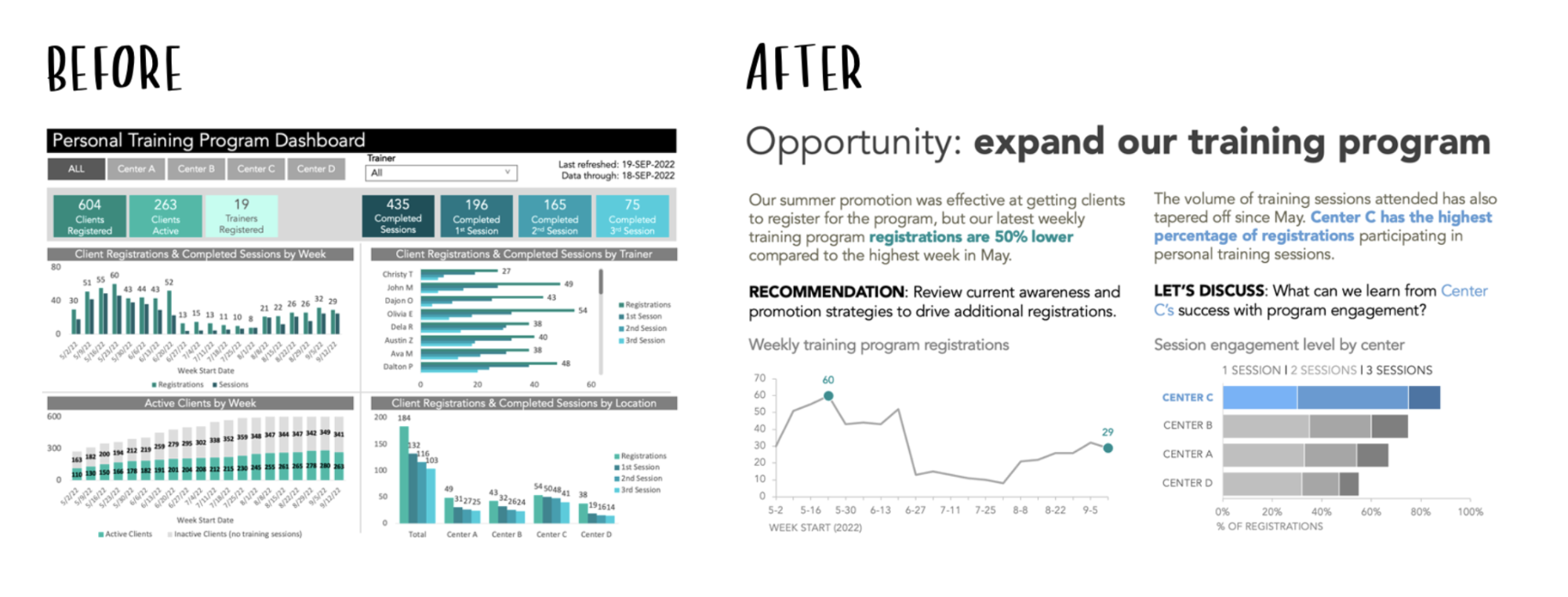 Brian's point about stringing metrics together into a broader narrative becomes clearer when you see a real-world data storytelling example in action. Storytelling with Data shows how they rebuilt a dense dashboard as an infographic that leads with the key insights related to a reviewer’s key concerns.