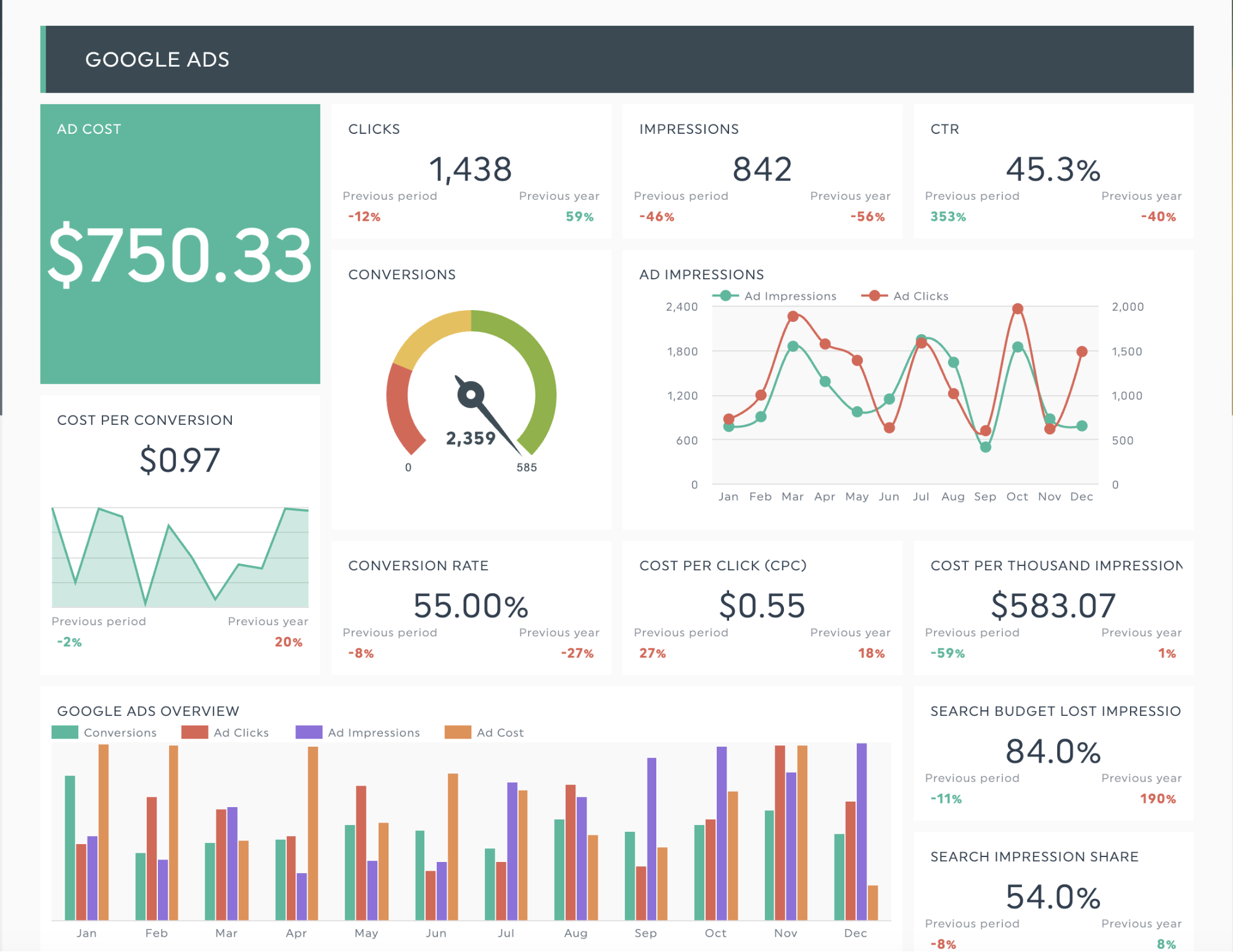 Our PPC reporting template lets you visualize performance by showing Google Ads metrics next to Bing Ads data and landing page results: