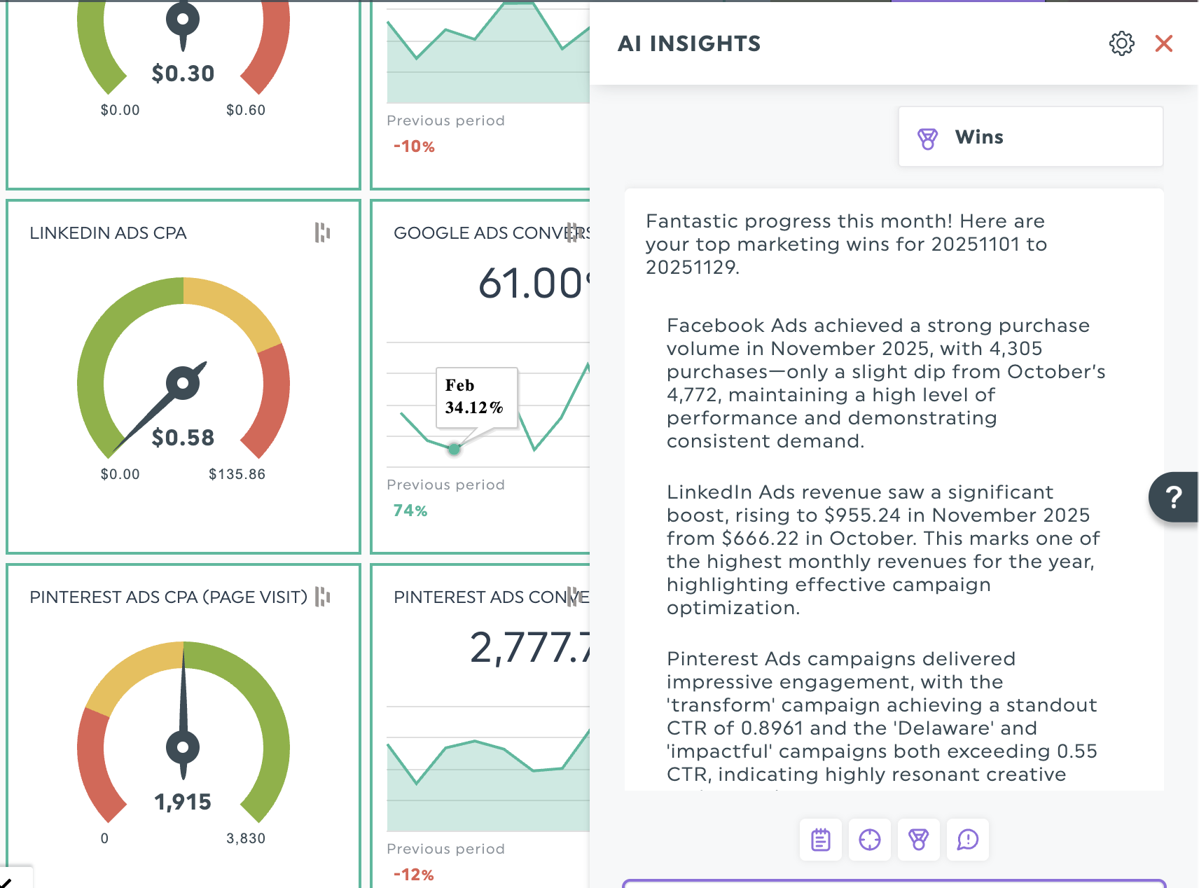 DashThis's AI Insights acts as an on-demand second analyst, scanning your data and highlighting important changes and unusual patterns you might miss.