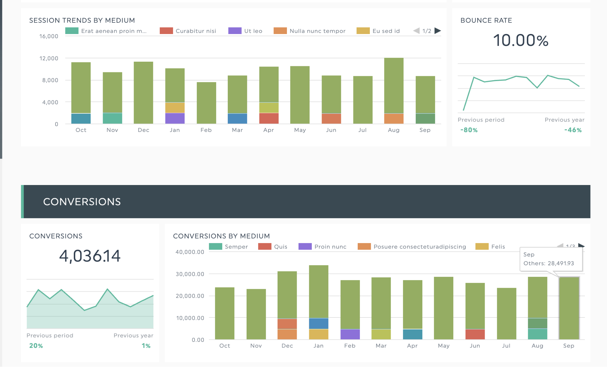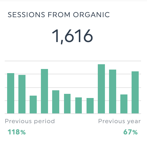Here, a stacked column chart breaks down totals into components and tracks changes across time periods. This format effectively displays SEO metrics like organic traffic percentage or total conversions from organic sources across months. The clear comparison between time periods can help you show the impact of your SEO results and strengthen your case during a client campaign review.