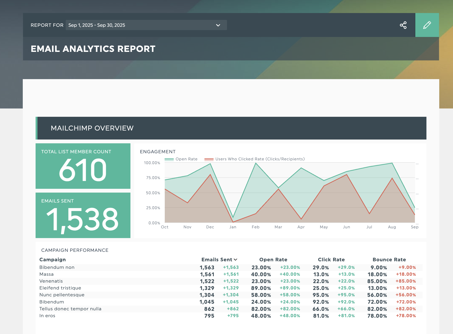 Email marketing reports show both raw numbers (list size, opens, clicks) and percentages (open rate, bounce rate). To assess whether your subject lines need A/B testing, plot your open rate and click-through rate (CTR) on a line graph to spot patterns in how subscribers interact with your emails.