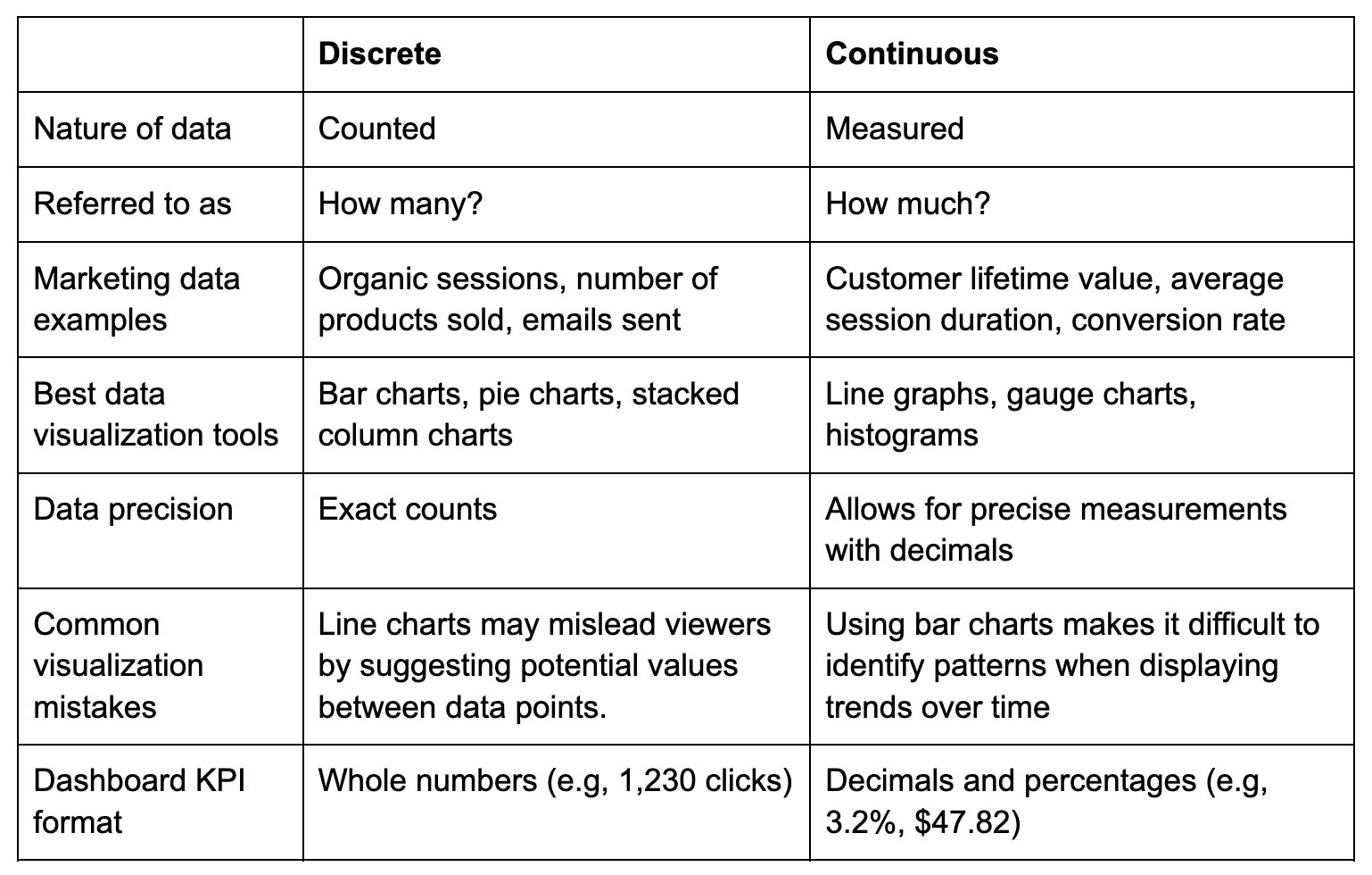 Choosing the right visualization for your data type prevents client confusion and builds trust in your analytical expertise. Use this summary table to quickly identify the difference between these types of data.