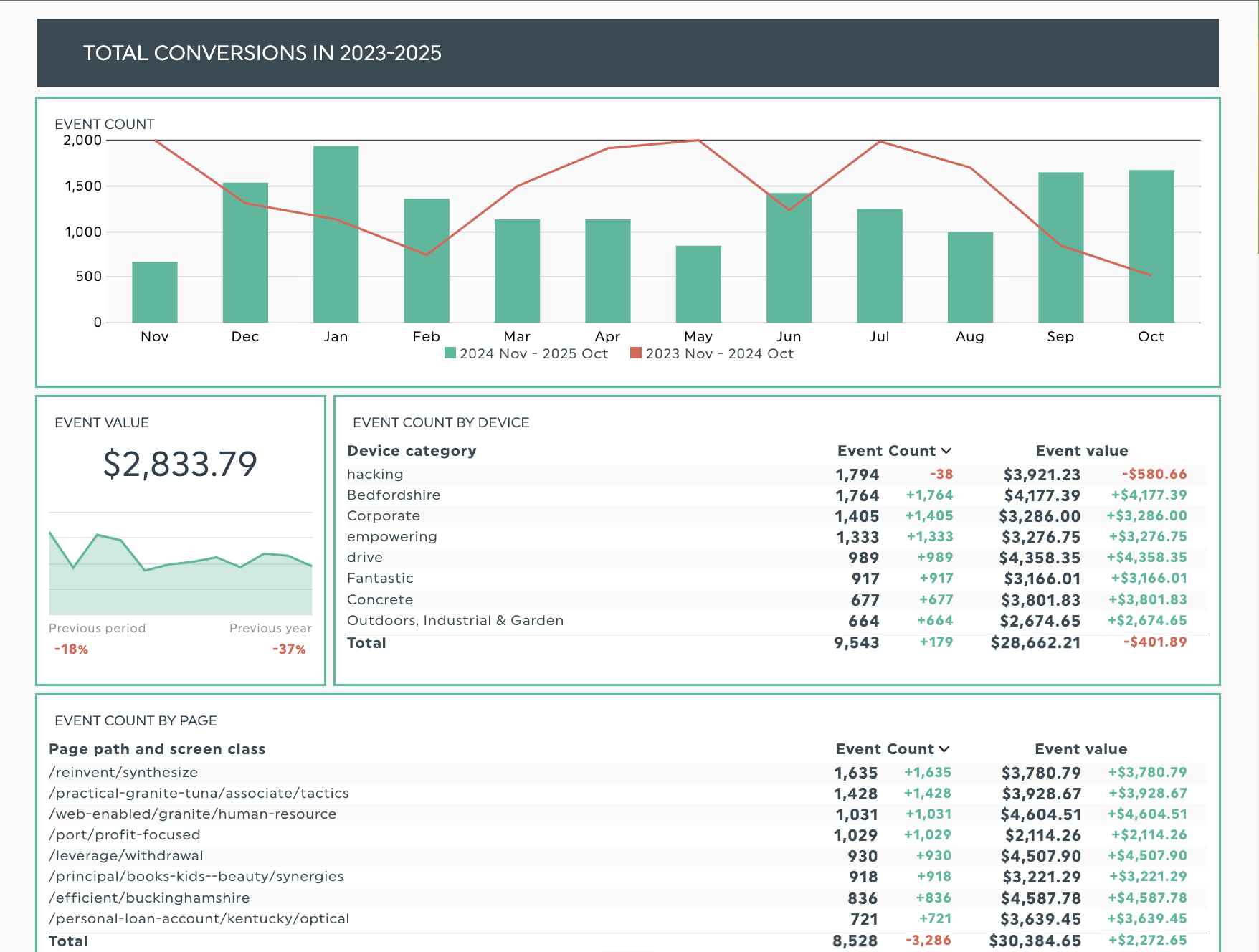 Let's say you need to compare your total conversions over the entire year to identify any trends or patterns. A simple bar chart and line graph can show how trends vary over the two years, so you can quickly zero in on peak and lull periods for further discussion.